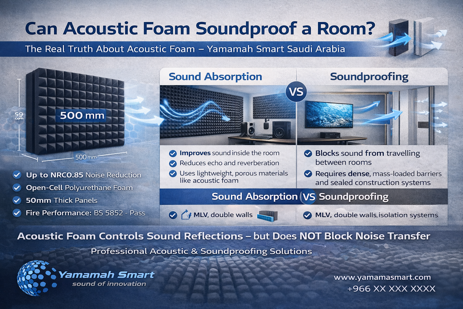 At Yamamah Smart Saudi Arabia, we believe that understanding the difference between sound absorption and soundproofing is the key to choosing the right solution. This article explains the real function of acoustic foam panels, when to use them, and when you need additional soundproofing materials.